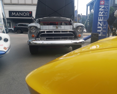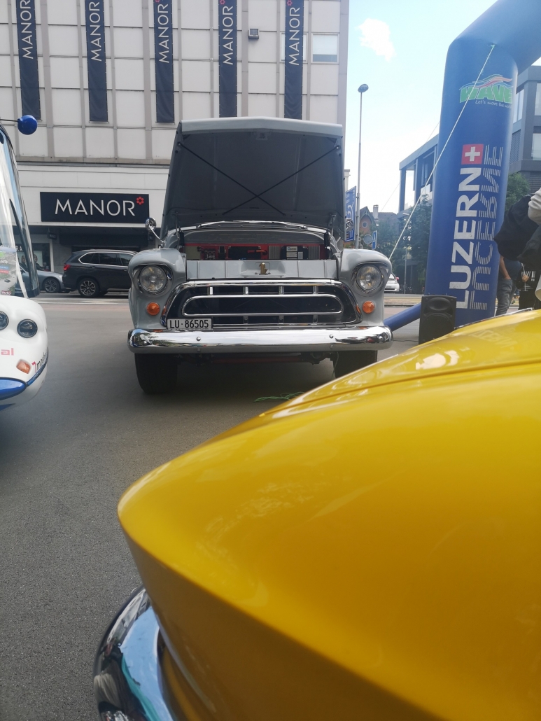 Mit der Zieleinfahrt in Zug gingen die tollen Tage der WAVE zu Ende. Und Dinora fand sogar noch einen Artgenossen, den 1957er Pick-up Chevrolet Task Force 3100 von Walter Fassbind. Walter war an der WAVE zwar zweirädrig unterwegs, hat seinen Pick-up aber schon vor einigen Jahren zum Elektroauto gemacht. Wir finden: Die beiden Autos passen super zusammen!